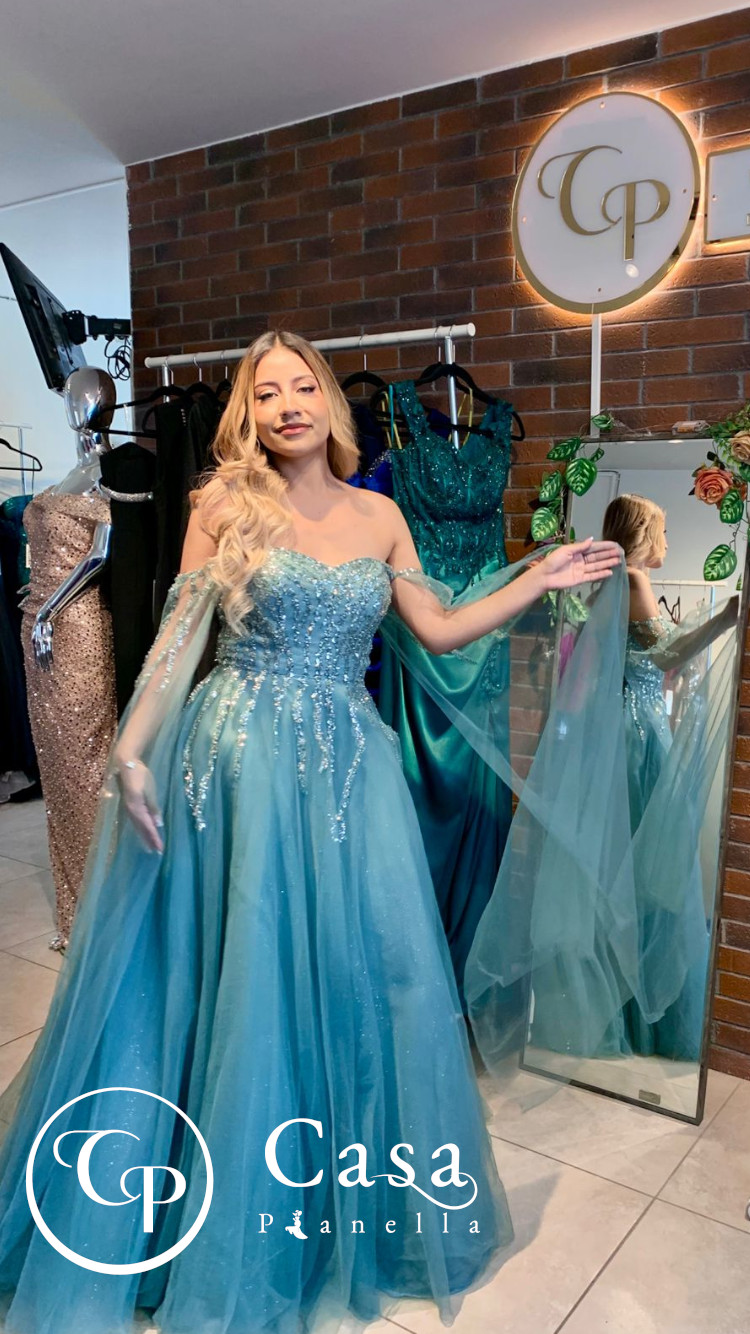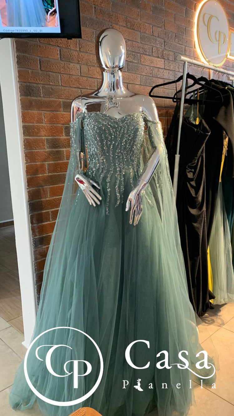 Vestido pedrería y cauda en mangas
